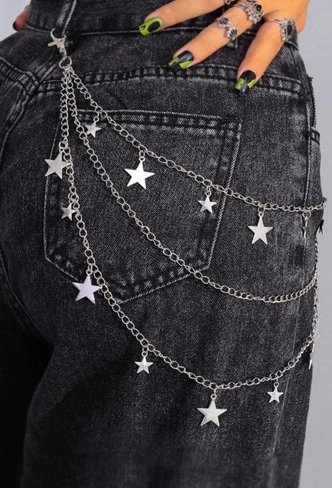 Gri renkte, yıldız figürlü çoklu zincir katmanlarına sahip, işleme detaylı pantolon zinciri, trendi punk tarzı için uygun. ✨