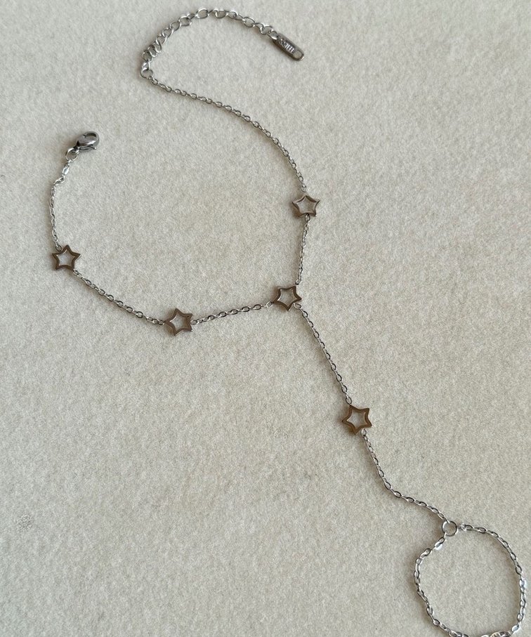 Gümüş renkli, yıldız detaylı kadın el zinciri. Minimalist bohem tarzıyla günlük kullanıma uygundur. ✨