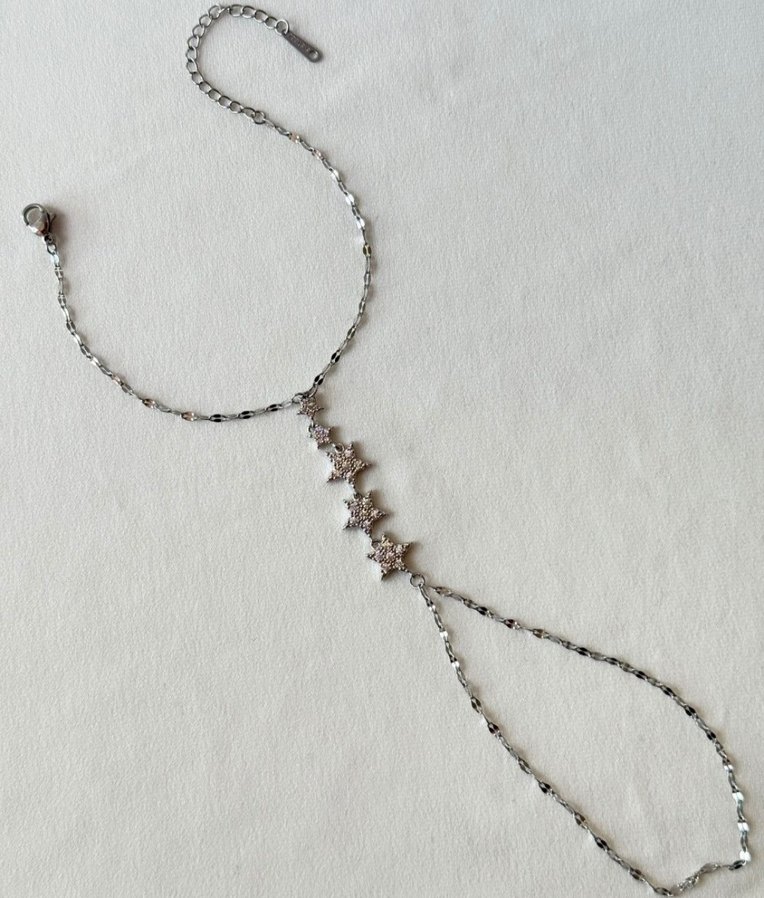 Gümüş renkli zincir ve yıldız detaylı, bohem tarzda kadın el zinciridir. Günlük kullanıma uygundur. ✨