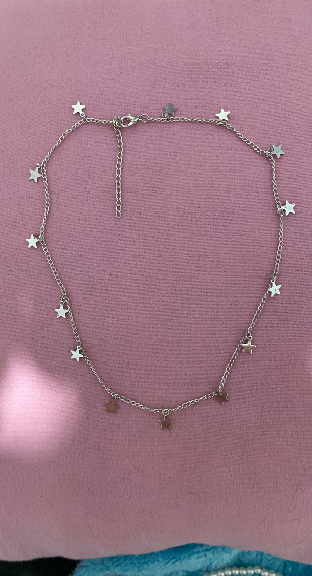 zincir kolye, zincir boyunca eşit aralıklarla küçük yıldız charm'larıyla süslenmiştir. Günlük kullanıma uygun midi uzunluktadır.