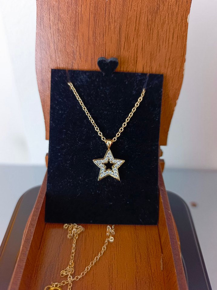 Parlak altın renkli, küçük kristallerle detaylandırılmış yıldız şeklinde kısa zincirli kolye. Bohem ve şık tarzlar için uygundur. ✨