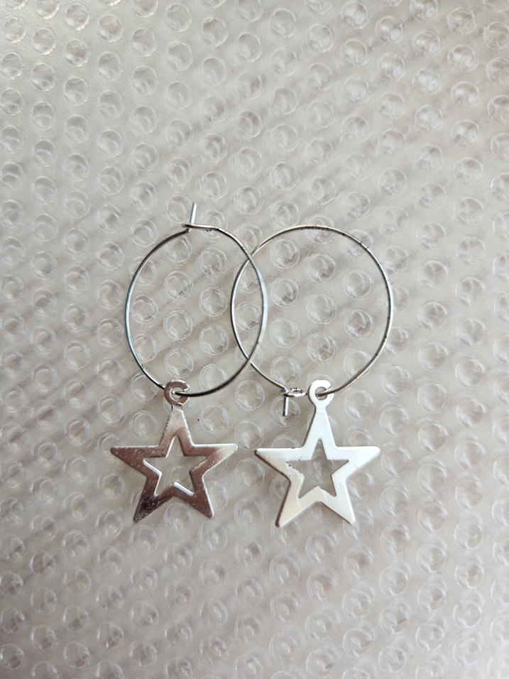 Minimalist halka küpeler, yıldız figürlü charmlarla sade ve şık bir görünüm sunar. Normal uzunlukta ve hafif yapıya sahiptir. ✨