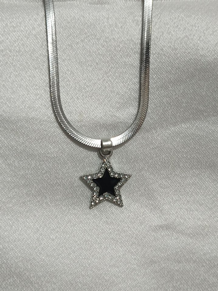 Zincir detaylı, siyah ve gri tonlarda yıldız figürlü kolye, günlük kullanıma uygun goth ve rock punk tarzında.