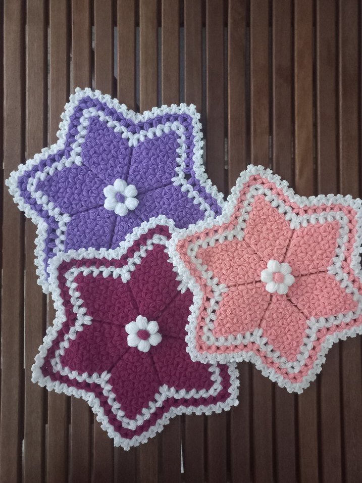 Mor, pembe ve bordo renklerde, ortasında küçük çiçek detaylı el yapımı yıldız şeklinde örgü lif seti. Üçlü fiyatıdır.