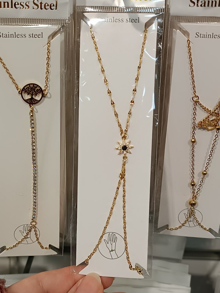 Altın renkli, zincir detaylı kadın el zinciri. Paslanmaz çelikten üretilmiş, bohem ve minimalist tarzda, günlük kullanım için uygundur. ✨