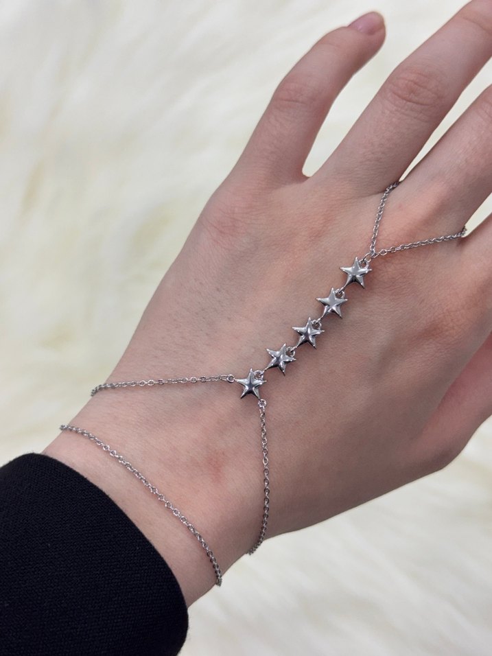 Parlak zincirli, yıldız detaylı kadın el zinciri, minimalist rock punk tarzıyla trend bir günlük kullanım aksesuarı. ✨