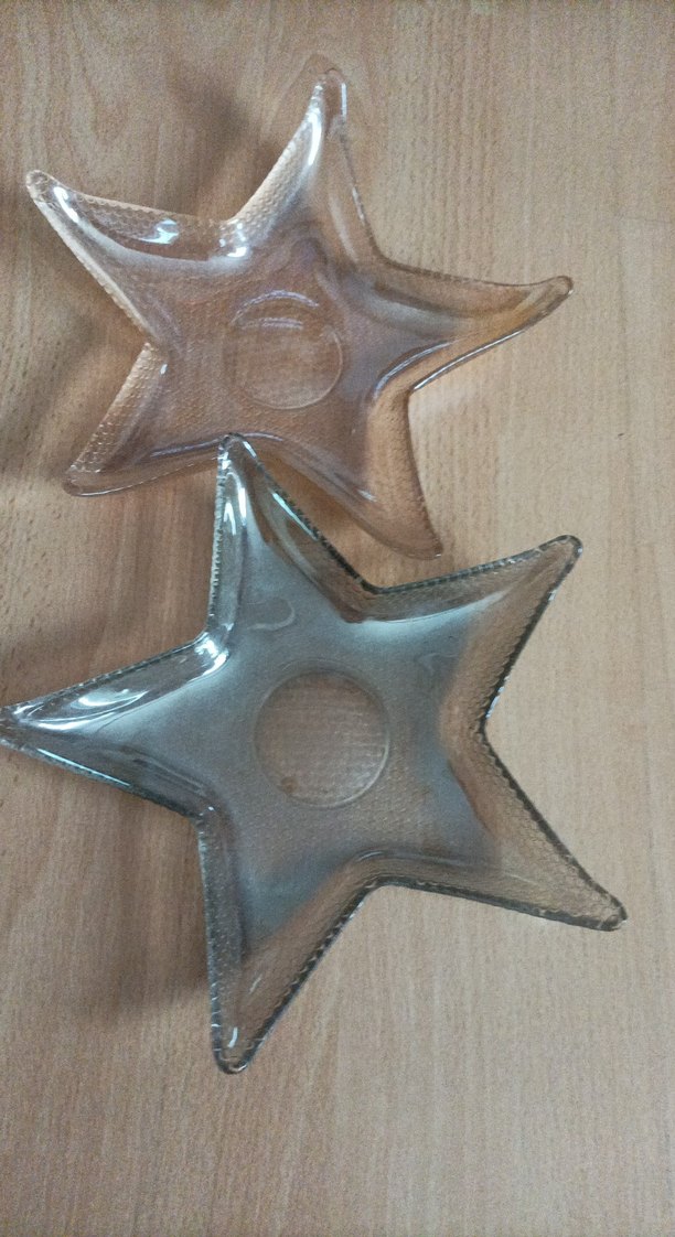 Bej ve gri tonlarında, yıldız şekilli iki cam tabak seti. Kenarlarında dokulu detaylar bulunur. Sunum veya dekorasyon için uygundur. ⭐