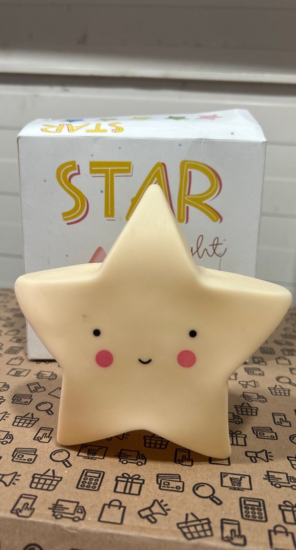 Yumuşak ışık veren beyaz yıldız şeklinde çocuk gece lambası, sevimli yüz ifadesiyle rahatlatıcı bir ortam sağlar. Ambalajında "STAR" yazısı bulunur. ⭐