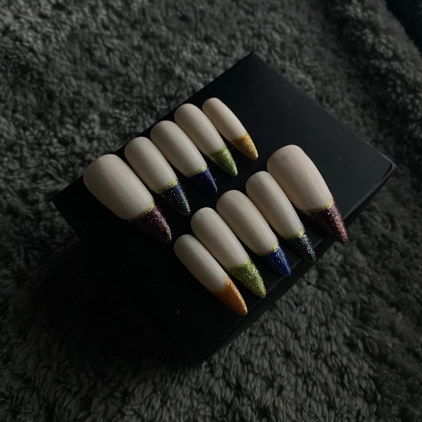 Yeşil, mavi, altın ve mor gibi koyu parlak tonlarda çok renkli tırnak süslemeleri. ✨