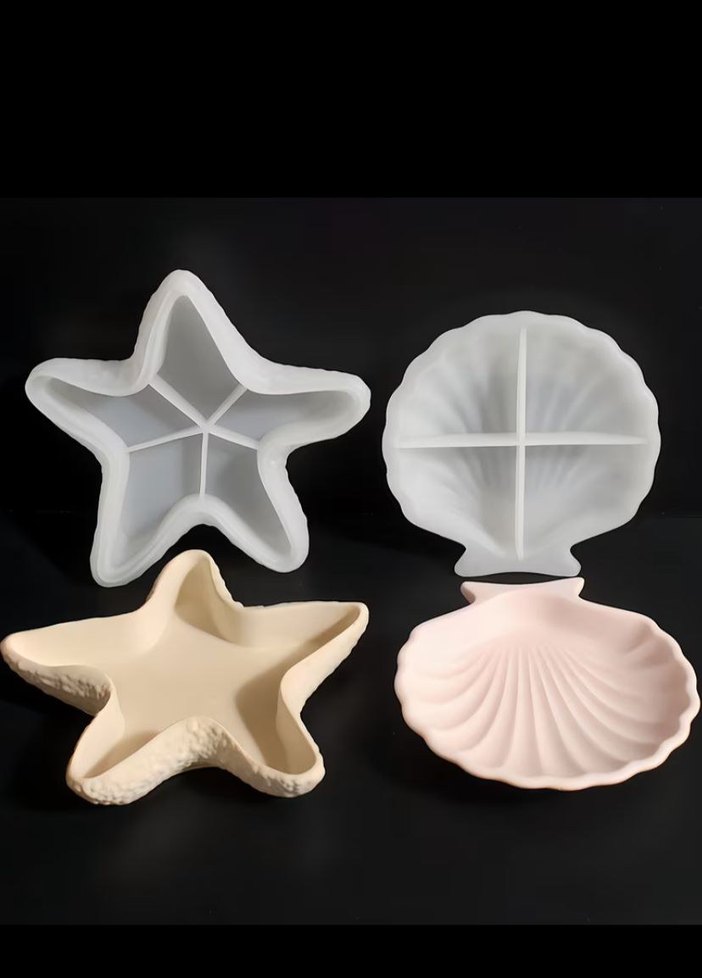 Açık renkli yıldız ve deniz kabuğu şekilli silikon kalıpları, beyaz renkte olup detaylı tasarıma sahiptir.