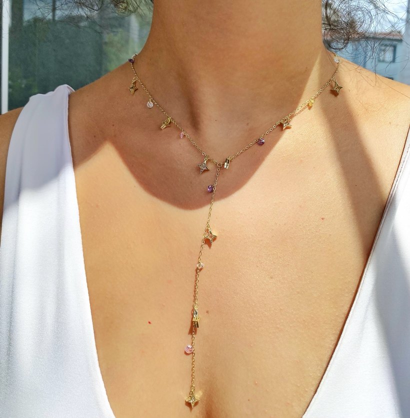 çok renkli zincir ve yıldız detaylı kısa mini kolye. Günlük kullanım için uygun. ✨