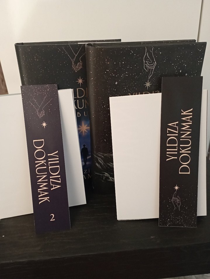 "Yıldıza Dokunmak" roman seti, yıldızlı gece kapağı ve eşleşen ayraçlarla iki ciltten oluşuyor.