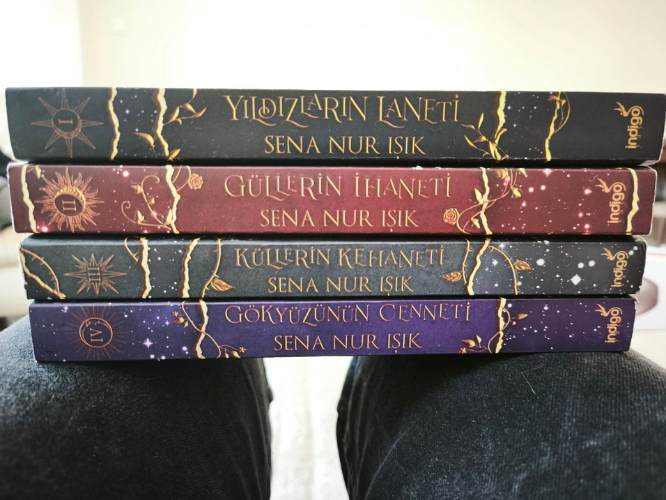 Sena Nur Işık'ın 'Yıldızların Laneti', 'Güllerin İhaneti', 'Küllerin Kehaneti' ve 'Gökyüzünün Cenneti' adlı 4 kitaplık seti.yaninda lanetlerin tarihi adlı ek kitapta geliyor ayraç ve poster içinde