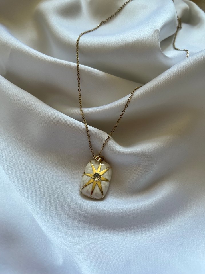 Altın renkli zincir detaylı, bohem tarzda, yıldız desenli ve ortasında taş bulunan tie-dye görünümlü midi uzunlukta kolye. ✨