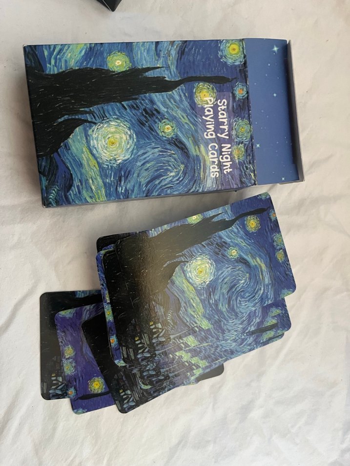 Vincent van Gogh'un Yıldızlı Gece tablosu temalı, canlı ve hareketli gece gökyüzü desenli oyun kartları.