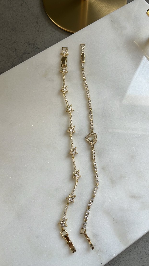 Altın renk zincir bileklikler, yıldız ve kalp detaylarıyla minimalist tarzda günlük kullanıma uygun. Hafif ve sade işleme ile zarif görünüm sunar. ✨