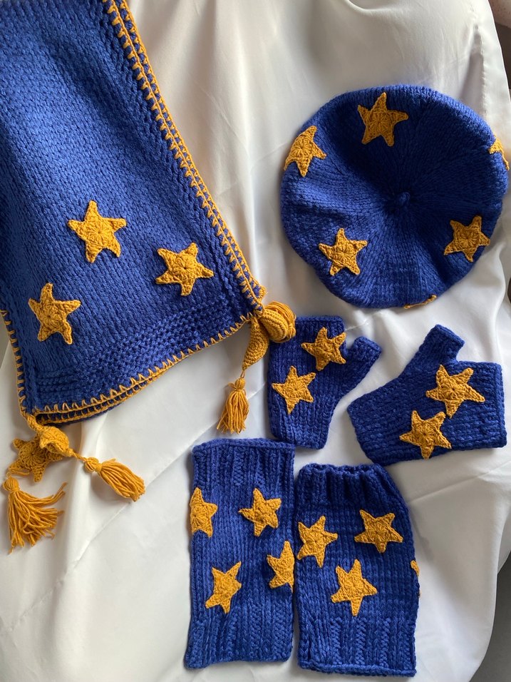 Sarı yıldız işlemeli koyu mavi örgü bere, eldiven, tozluk ve püsküllü atkıdan oluşan bohem tarz set.