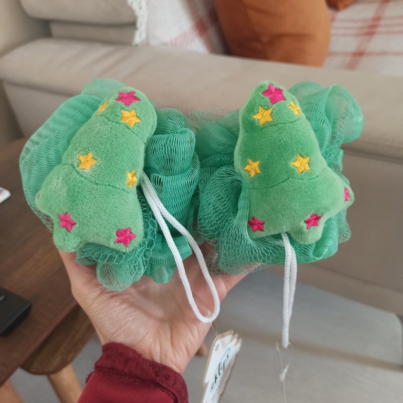 Yıldız desenli, asma ipli renkli yeşil banyo süngerleri. Yumuşak dokusu ile etkili temizlik sağlar.