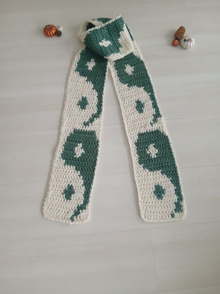 Yeşil ve kırık beyaz renklerde, #yinyang desenli unisex atkı. Rahat ve bohem tarzı yansıtın. Ölçüleri resimlerde mevcuttur.