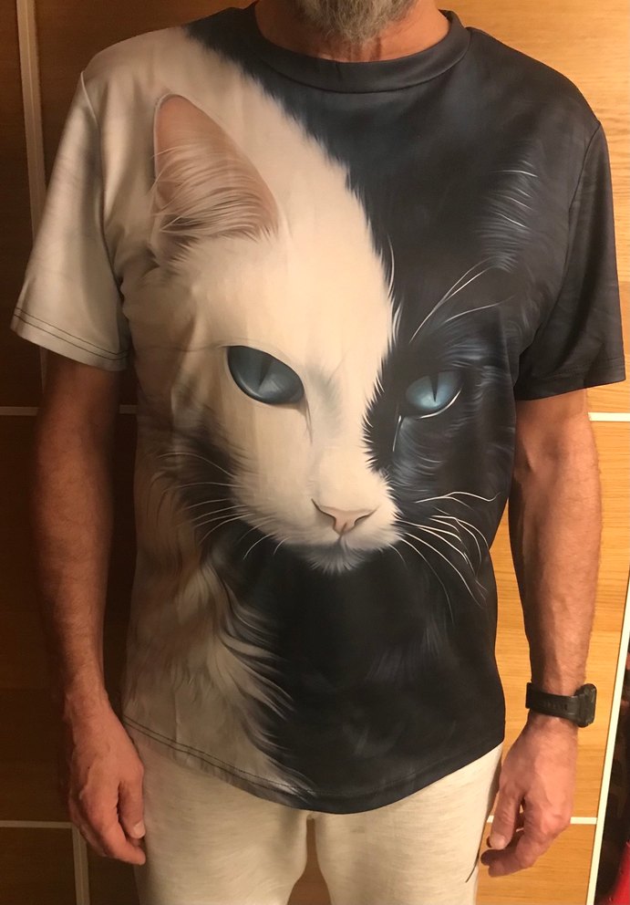 Grafik baskılı, akrilik dokuma t-shirt. Ying yang formunda çift kedi baskısı arkalı önlüdür. Giyilmemiştir ancak etiketi yoktur. Ölçüleri fotoğraflar da mevcuttur.
