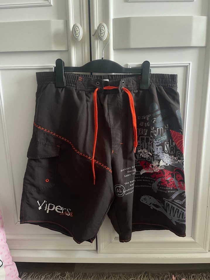 Siyah baskılı, kemerli, bol kesim erkek mini şort. Yipers markalı, plaj için uygun, avant-garde tarzda.