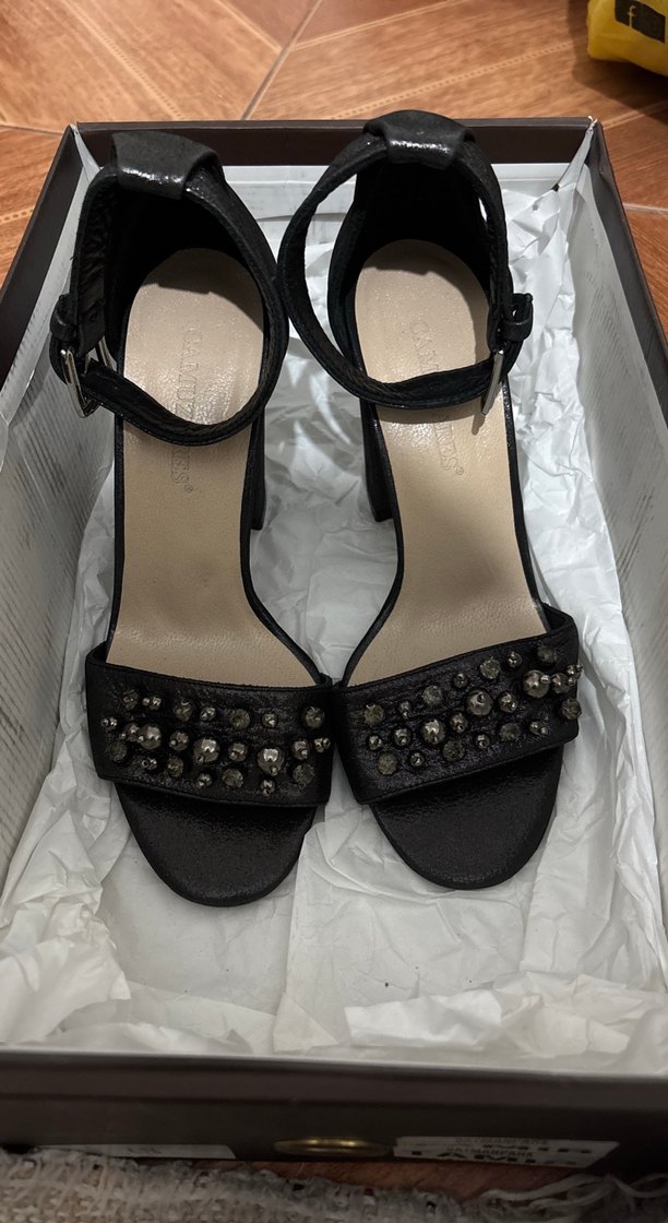 Tokalı bantlara ve yırtıcı desenli deri detaylara sahip siyah yüksek topuklu kadın ayakkabısı. Gotik ve şık tarzıyla romantik akşamlar için uygundur. Zara markası değildir
