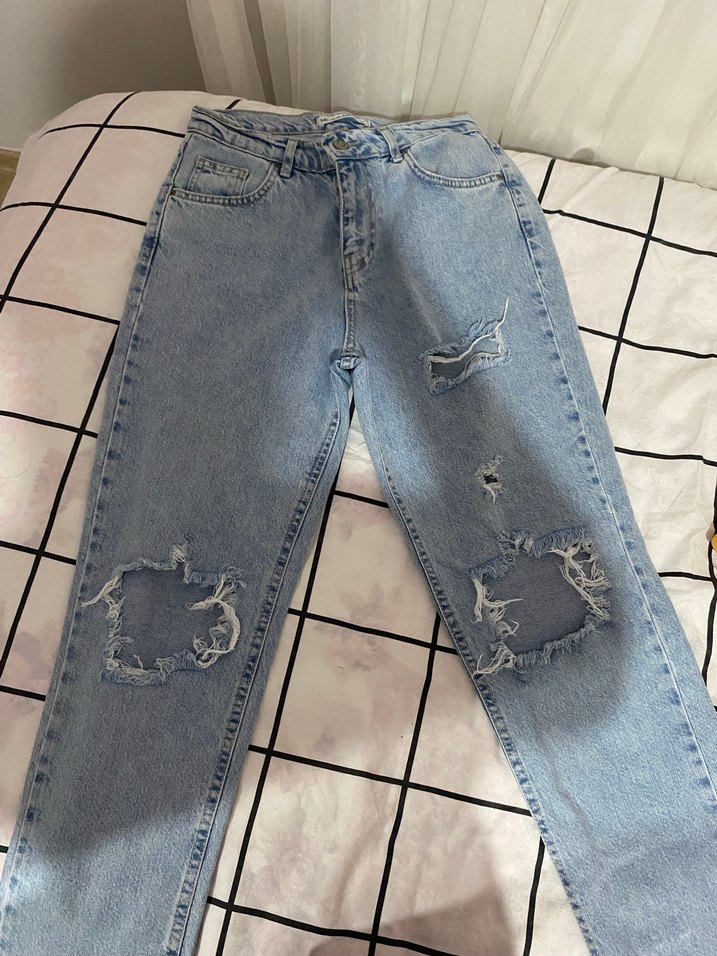 Bol kesim, pastel mavi denim kumaştan, yırtık detaylı ve tokalı bel kısmıyla günlük sokak stili için uygun kadın pantolon.