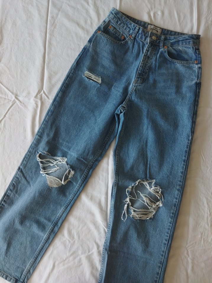 Yüksek bel, bol kesim, mom jean mavi kadın denim jean. S beden