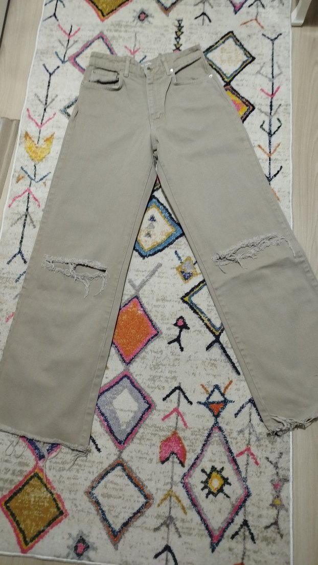 Bej renkli, salaş kesim kadın pantolon, dizlerde yırtık detayları ve uzun paça tasarımı ile sokak stiline uygun. sorunsuz yeni bedeni olmadığı için satıştadır