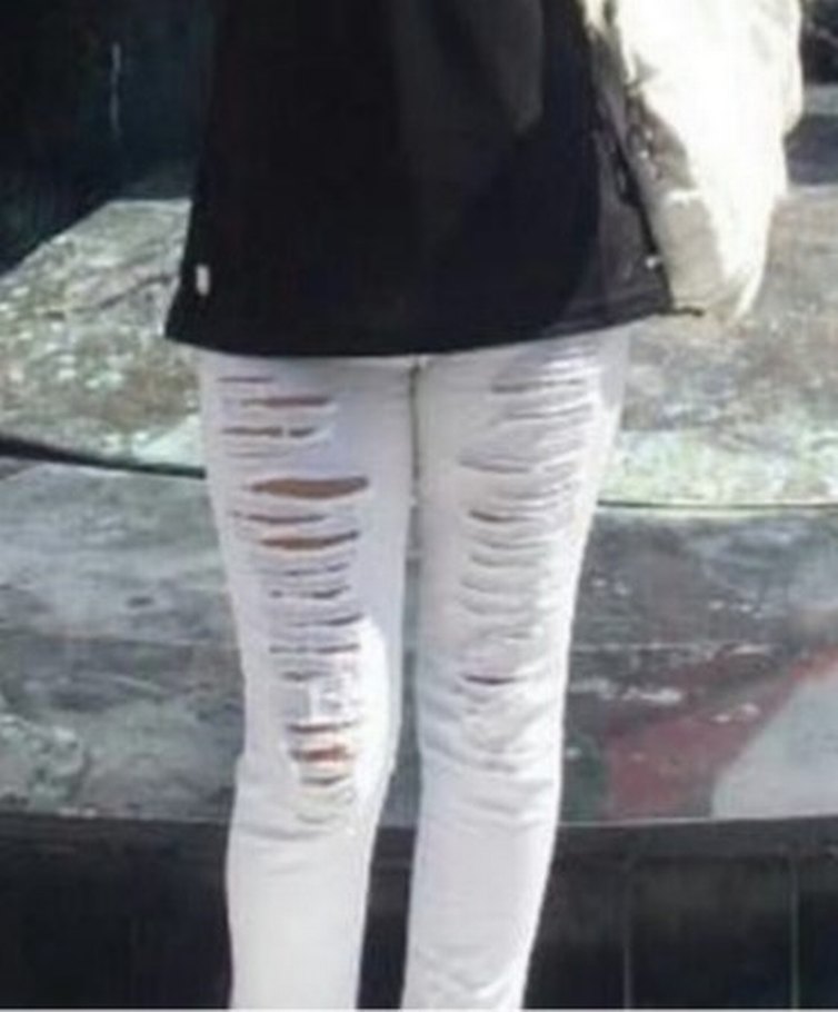 Yırtık detaylı beyaz, dar kesim, likralı denim pantolon. Günlük sokak stili için uygun ve şık bir parça. Boy:86 cm.