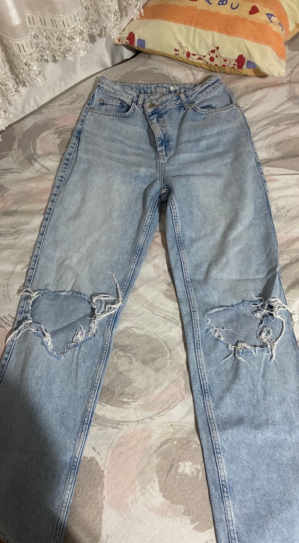 Bol kesim, yırtık detaylı ve kısa yırtmaçlı, mavi-gri tonlarında kot pantolon. Günlük rahat kullanıma uygundur.