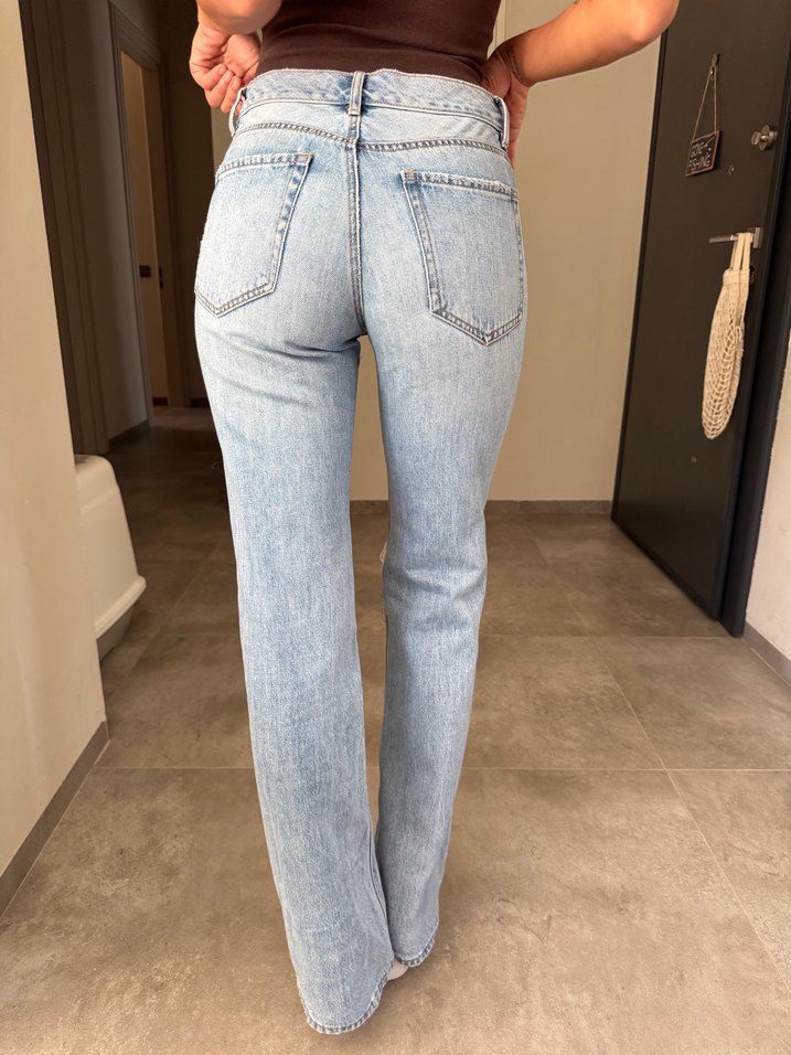 Buz mavi renkte, yırtık detaylı bol kesim kadın denim pantolon. Normal boy ve günlük kullanıma uygun rahat bir modeldir.