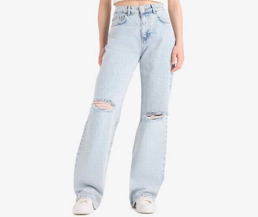 Dizlerinde yırtık detayları olan gri renkli, bol kesim kadın denim jean. Rahat ve gündelik stil için midi boyda, sokak modasına uygun.