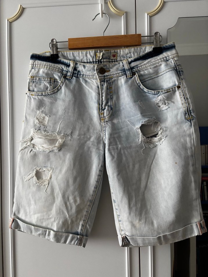 Yırtık detaylı, bol kesim ve tokalı bel bandına sahip gri kot şort, günlük rahat stil için uygundur. Sayılı giyilmiştir sadece küçücük yerinde. Kadar bir leke mevcut