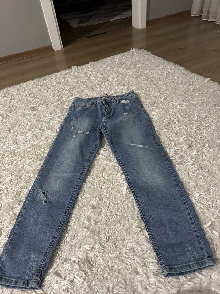 Gri tonlarında mavi renk, yırtık detaylı, rahat kesim kadın kot pantolon. Midi boy, günlük ve sokak stiline uygun.