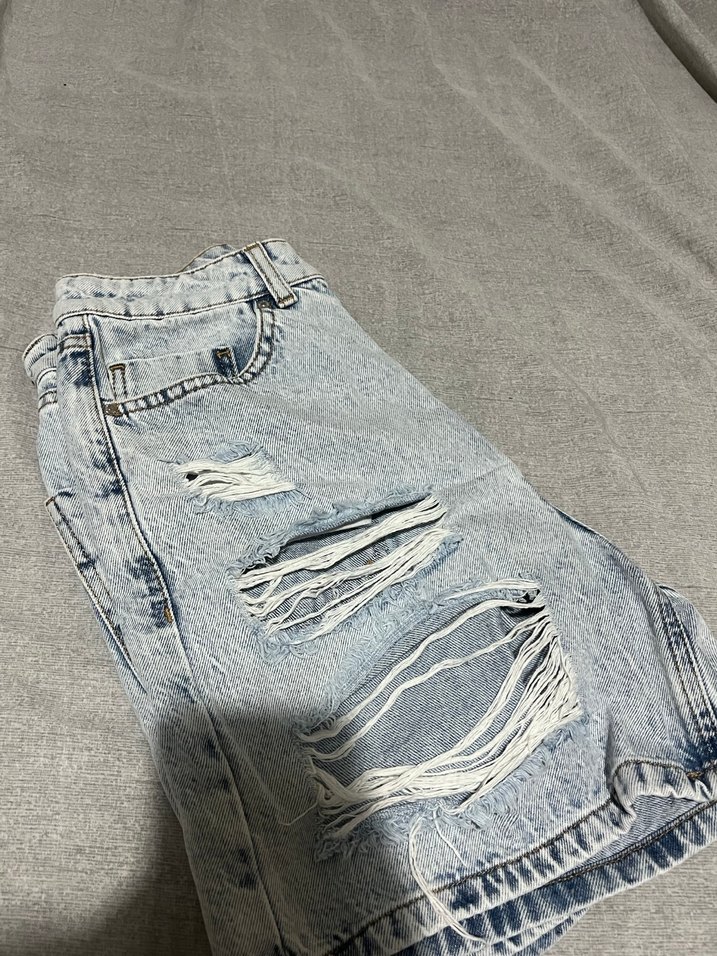 Yırtık Detaylı Gri Midi Kot Şort