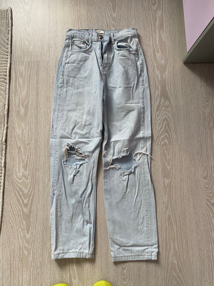 Yırtık detaylı ve kemer tokalı, günlük sokak stiline uygun.