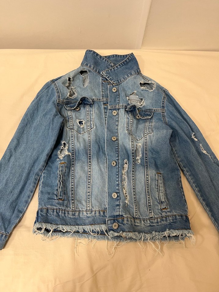 Mavi düğmeli denim ceket, uzun kollu, notched yakalı ve bol kesimdir. Normal boyda, parlak dokunuşlu ve yırtık detaylıdır. Günlük kullanıma uygundur.