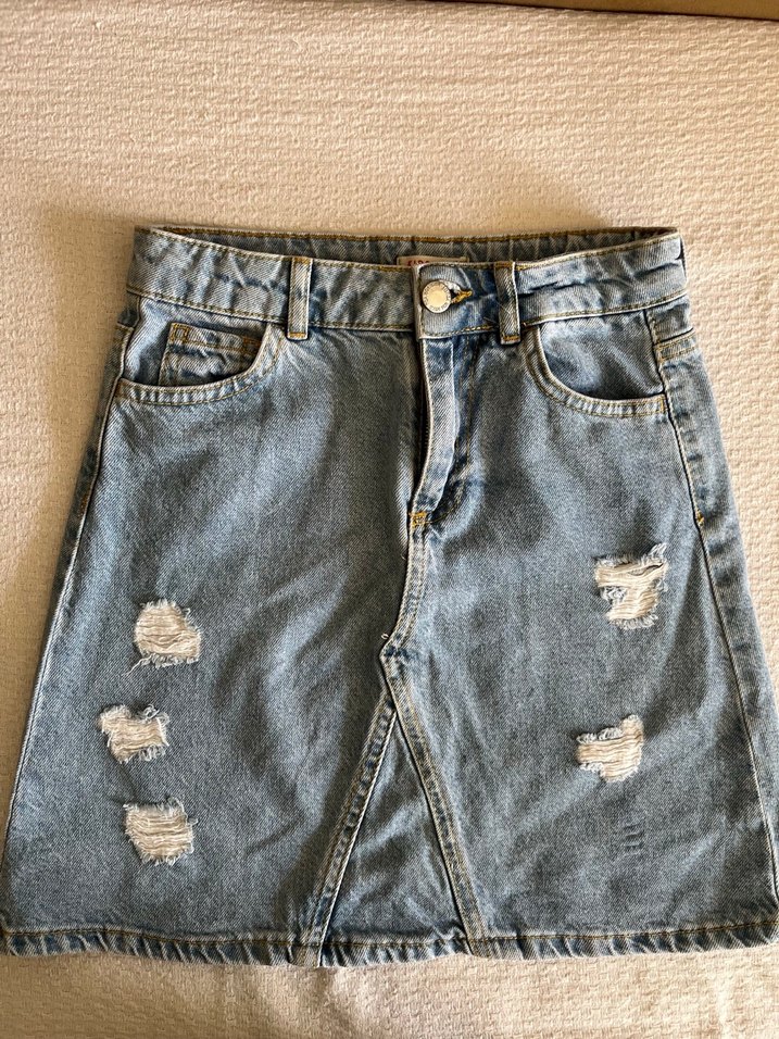 Yırtık detaylı, bol kesim kot midi etek, ön yırtmaçlı ve kemer tokalıdır. Günlük sokak stili için uygundur.