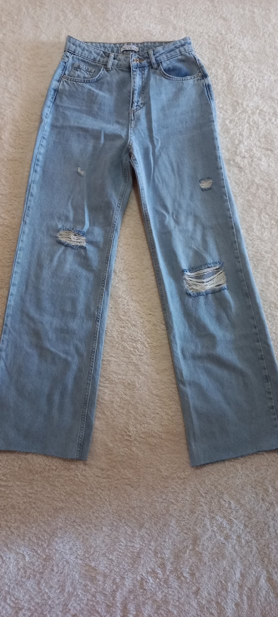 mavi renkte, yırtık detaylı ve paça yırtmaçlı bol kesim kadın jean, rahat yüksek bel...sorunu yok..boy:108 cm