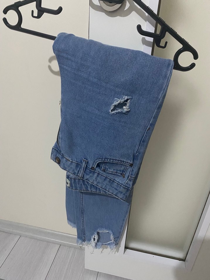 Gevşek kesim, yırtık detaylı mavi denim pantolon. Midi boyda, günlük kullanıma uygun rahat ve trend bir model.