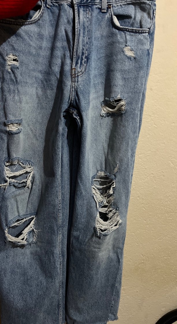 Yırtık detaylı, bol kesim mavi denim kot pantolon, normal boy ve tokalı detaya sahip, sokak stili ve günlük kullanım için uygundur.