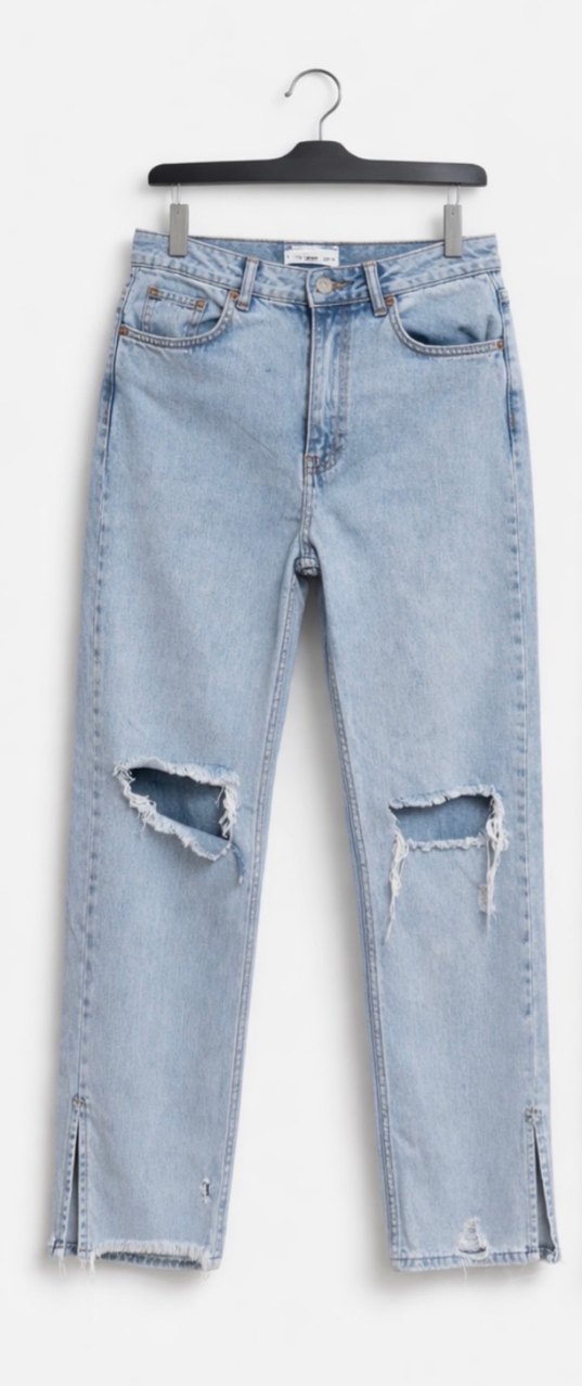 Yırtık detaylı, bol kesim mavi kadın denim pantolon. Dizlerde kesik ve normal, günlük rahat kullanım için uygundur.