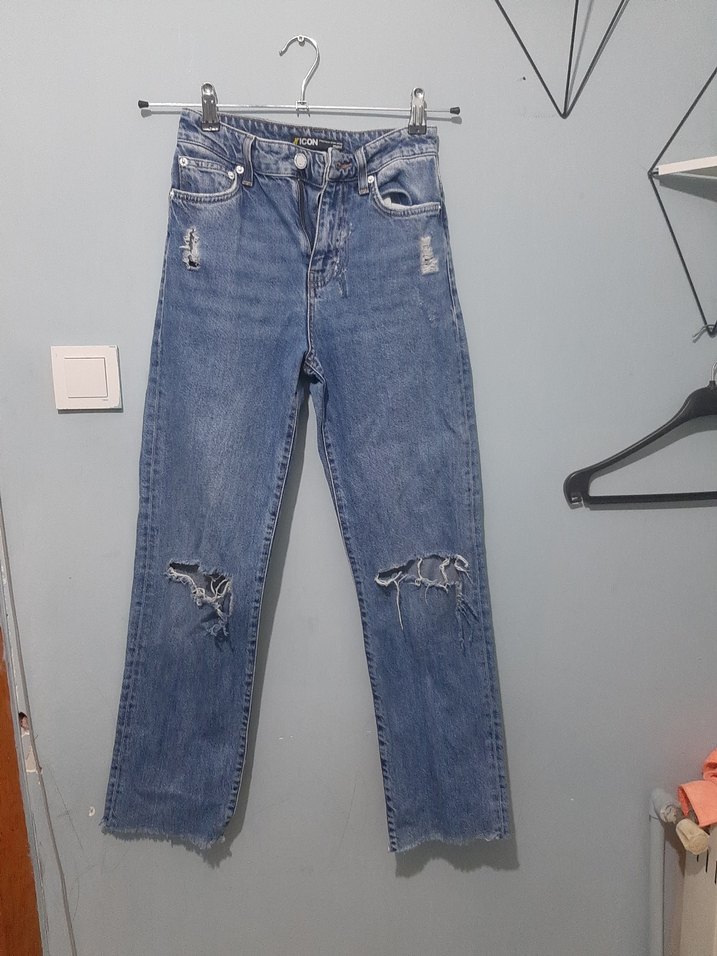 Yırtık detayları ve yırtmaçlı midi boyuyla rahat kesim mavi kadın denim pantolon. Sokak stili için uygun.