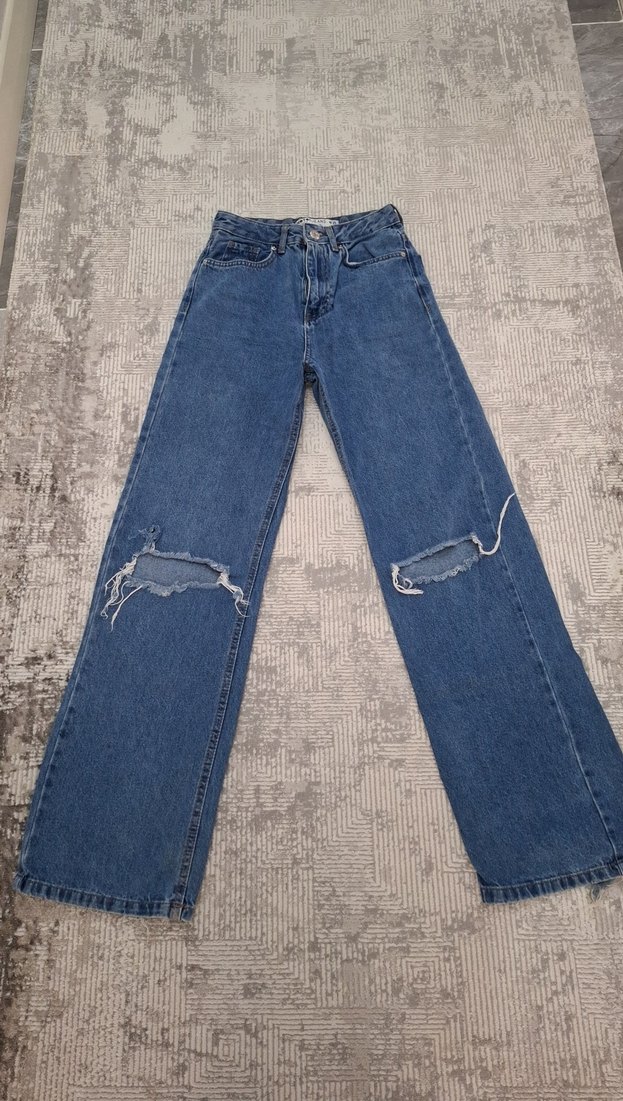 Yırtık detaylı, normal boy, regular fit mavi kadın denim pantolon, günlük kullanıma uygun rahat bir sokak stili sunar.