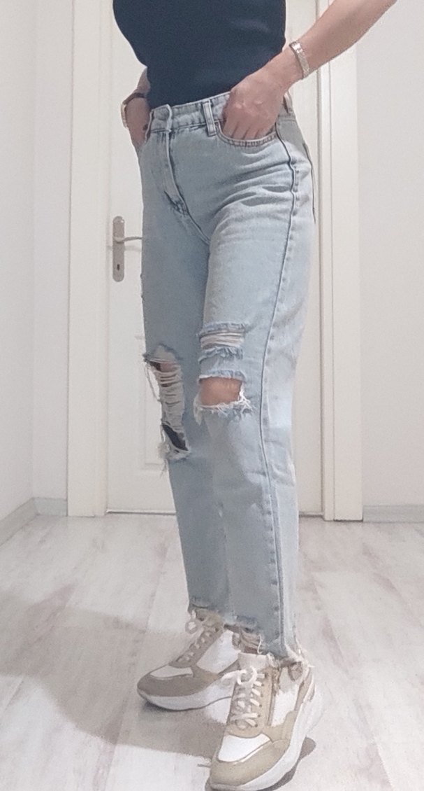Harika bir kesimi var.Çok tarz ve kaliteli Buz mavi renkli, yırtık detaylı,mom model, bol kesim kadın jean pantolon. Günlük kullanıma uygun rahat sokak stili.