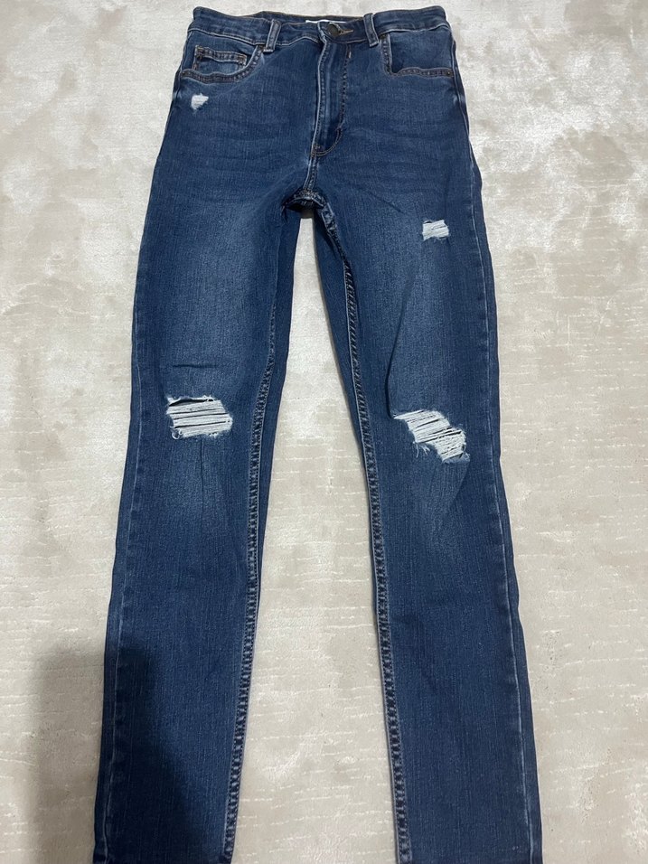 Yırtık detaylı, midi boy, mavi renkli kadın skinny jean. Dayanıklı denim kumaştan, günlük rahat sokak stiline uygun.