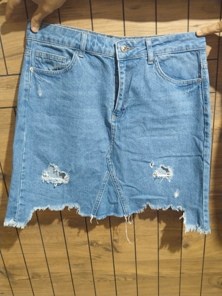 Yırtık detaylı, mavi renkte jean etek dilerseniz ölçü verebilirim