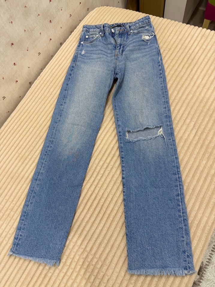 Mavi renkli midi boy, regular fit kot pantolon. Yırtık ve slit detaylarıyla gündelik kullanıma uygundur.