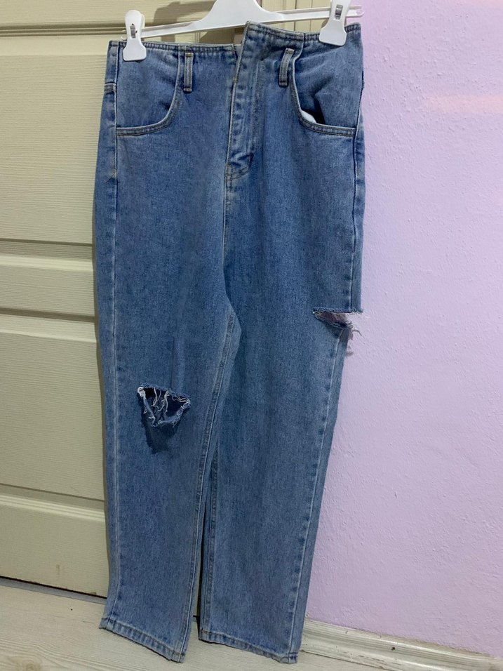 Yırtık detaylı, bol kesim pastel mavi kadın kot pantolon. Midi boy ve desensiz, günlük kullanıma uygun rahat bir model.